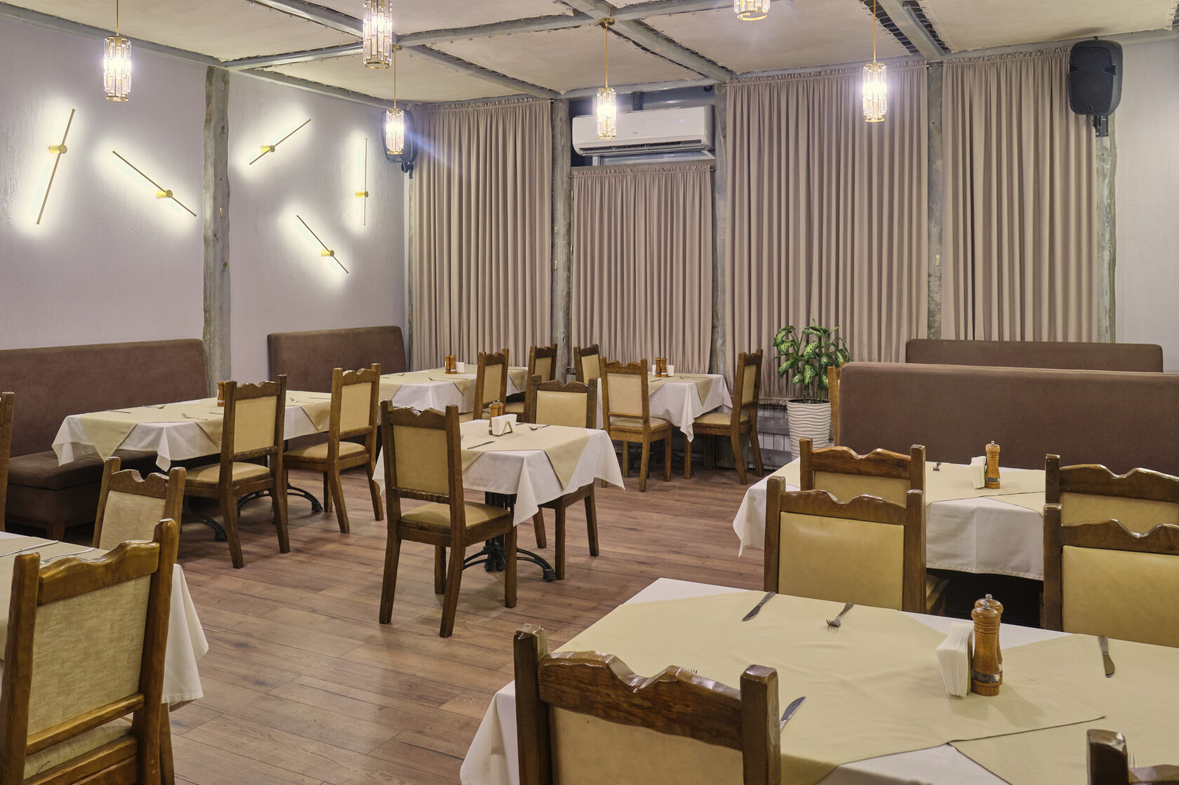 В банкетном зале есть оборудование, необходимое для проведения программ и танцев.